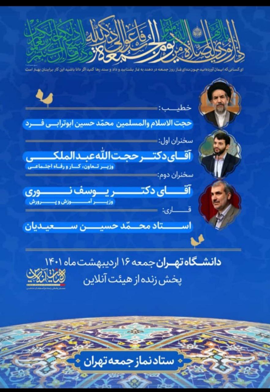 به گزارش خبرگزاری صدا و سیما به نقل از شورای سیاستگذاری ائمه‌جمعه، دکتر حجت الله عبدالملکی وزیر تعاون و کار و رفاه اجتماعی و دکتر یوسف نوری وزیر آموزش و پرورش سخنرانان پیش از خطبه‌های نماز جمعه این هفته هستند.