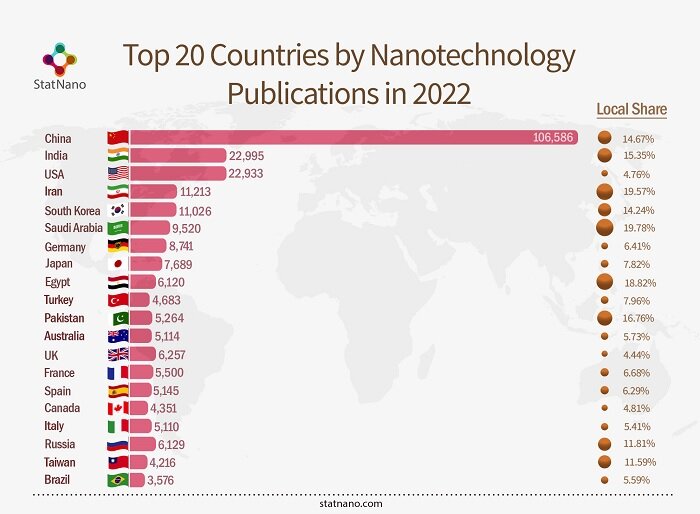به گزارش خبرگزاری صدا و سیما به نقل از پایگاه اطلاع‌رسانی استت نانو که همه داده‌های مرتبط با فناوری نانو را منتشر می‌کند، طی سه سال (۲۰۱۹، ۲۰۲۱ و تا ۲۰۲۲) ایران را از نظر جایگاه انتشار مقالات مرتبط با فناوری نانو در رتبه چهارم قرار داده است. ایران به این ترتیب در این گزارش بعد از کشور‌های چین، آمریکا و هند در رتبه چهارم قرار دارد. جالب‌تر هم آنکه در گزارش ۲۰۲۲ این پایگاه اطلاع رسانی هند هم از آمریکا جلو زده و ترتیب چین، آمریکا و هند در سال‌های ۲۰۱۹ و ۲۰۲۰، به ترکیب چین، هند و آمریکا سپس ایران تبدیل شده است.